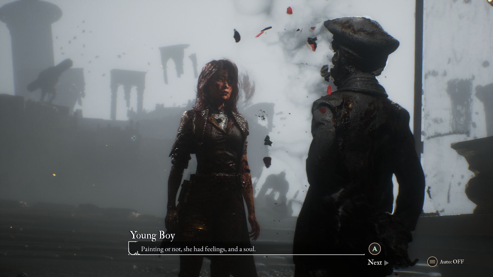 The degree to which every different part of the game is meshed with the other is incredibly impressive, and serves to make each of them better when seen alongside the other. And when we’re talking about audio, I’ll also talk about vocal performances. The whole cast does an incredible job, including some recognizable voices. Jennifer English, of Shadowheart in Baldur’s Gate 3 fame, as Maelle does a fantastic job. Charlie Cox (Daredevil) and Andy Serkis (Gollum) are also amazing as always. And those are the big names that I knew before, but everyone delivers great performances across the board. Maxence Cazorla as Esquie is particularly delightful in how bizarrely endearing he manages to be. Sometimes it sounds like he doesn’t know what the words he is saying mean. Often he’s nonsensical and barely connected to what’s happening, as beautific non-human immortals are wont to be. And then he slams an emotional hammer on you in the next sentence.